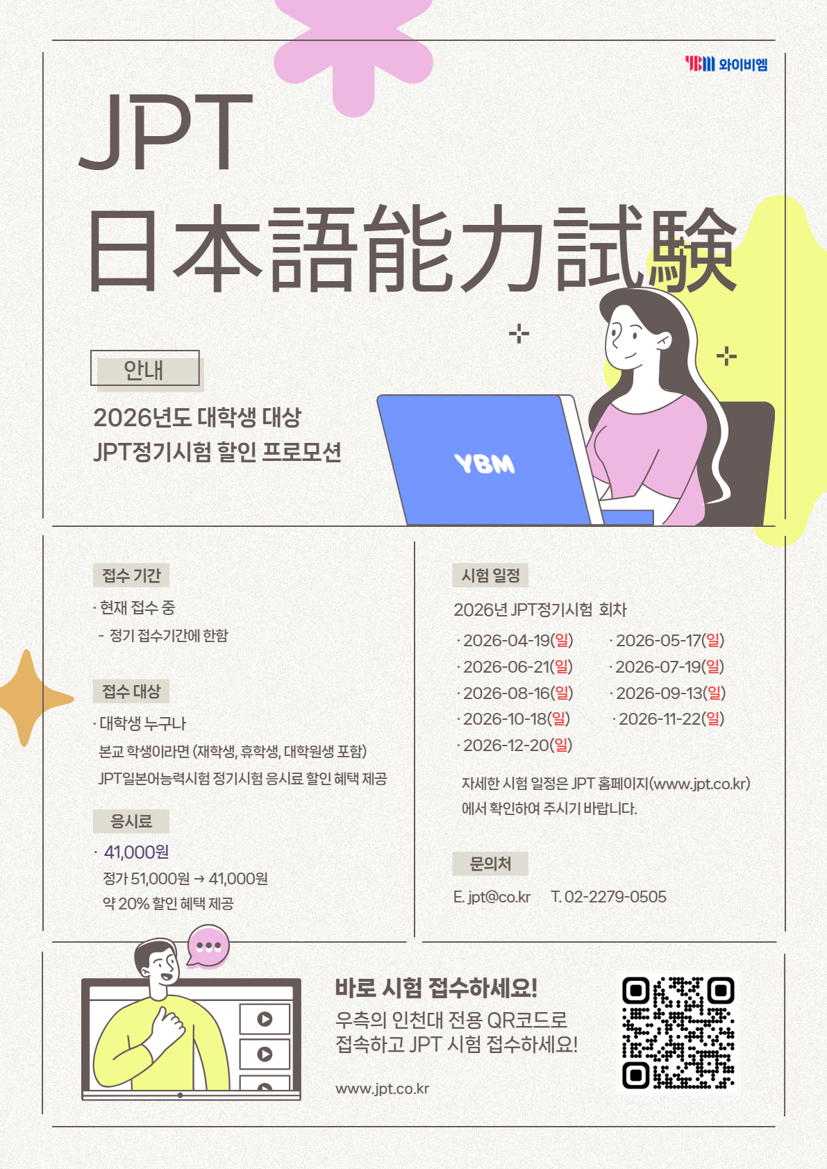 인천대학교와 YBM 한국토익위원회의 업무 협약에 따라 JPT 정기시험 응시료 할인 혜택을 제공하오니 재학생분들의 많은 관심 부탁드립니다.