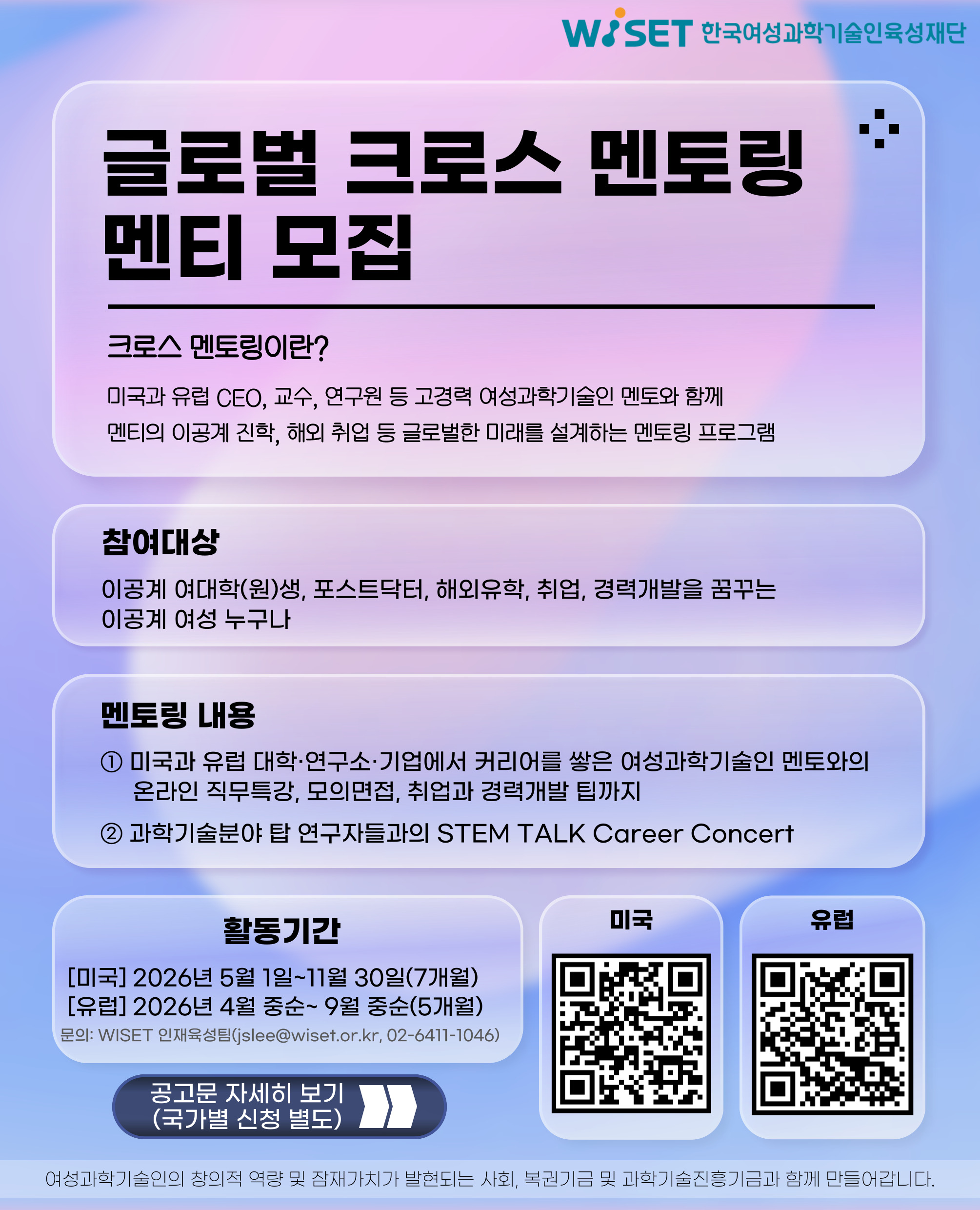 (활동 기간) [미국] 5월~11월/ [유럽]4월 중순~9월 중순 (활동 내용) 직무 특강 및 모의 면접, 1:1 맞춤형 멘토링, 해외 취업/진학 정보 공유 등 (신청 링크) https://bit.ly/wisetcross2026 |