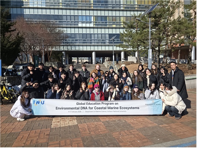 인천대학교 해양학과와 미국 William & Mary 대학이 공동으로 운영하는 국제 교육 프로그램 “Global eDNA Class”가 2026년 1월 인천대학교에서 진행되었다. 본 프로그램은 eDNA(environmental DNA; 환경DNA)를 활용한 해양생물다양성 연구를 중심으로, 첨단 과학 교육과 문화 교류를 결합한 글로벌 스터디 어브로드 과정이다.