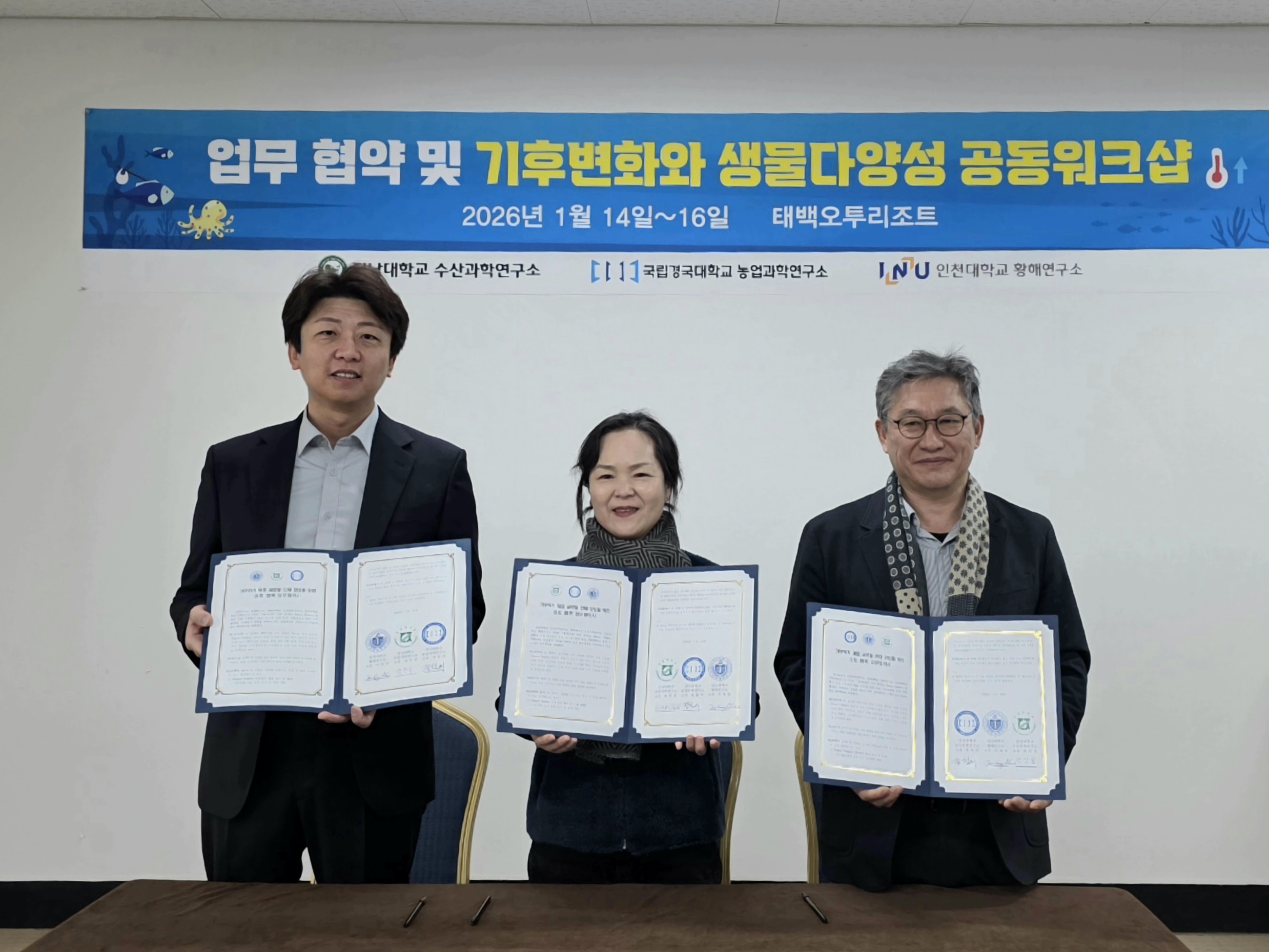 ❍ 인천대학교(총장 이인재) 황해연구소(소장 이재성)는 지난 1월 16일 국립대 중점연구소인 전남대학교 수산과학연구소와 경국대학교 농업과학연구소와 함께 기후위기 대응을 위한 지역 거점 연구 활성화 및 전문인력 양성을 목표로 업무협약(MOU)을 체결했다.